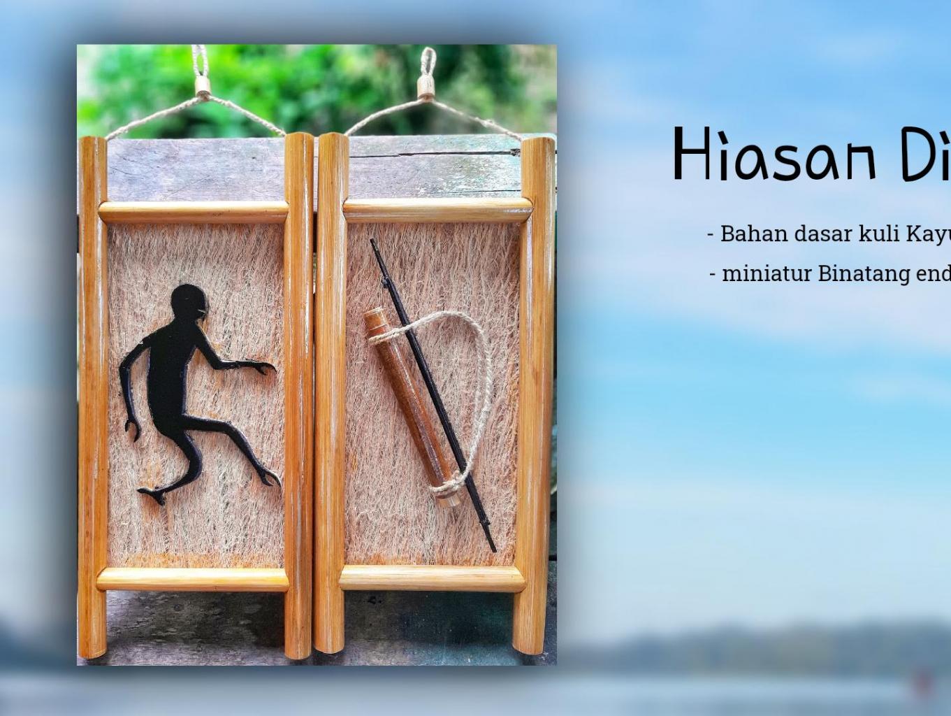 Hiasan Dinding yang terbuat dari bambu dan kulit kayu yang dihaluskan, kemudian pemilihan gammar tergantung selerah kita. biaasnaya ada miniatur panah pentawai, Gambar Monyet, gamabar Koraibit dll