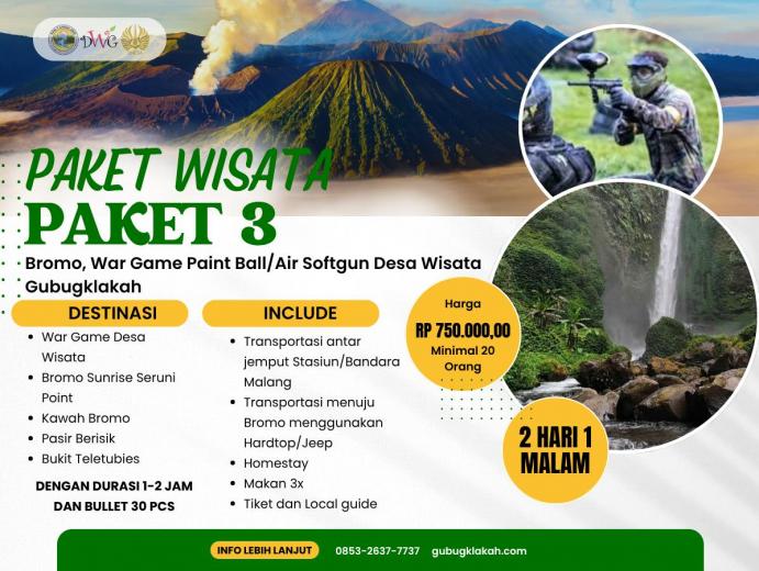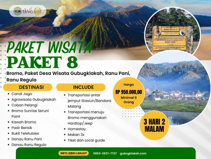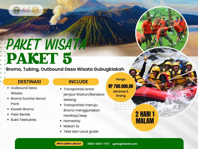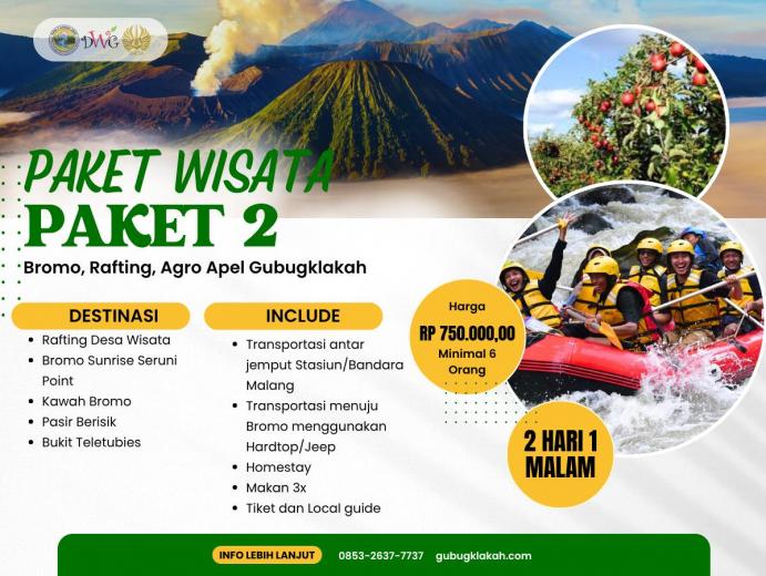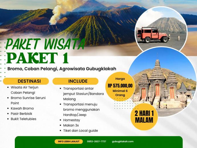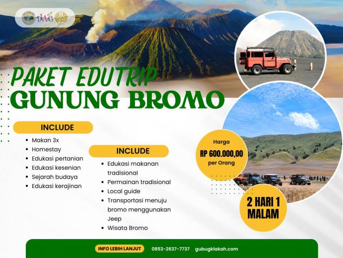 Paket Edutrip Desa Wisata Gubugklakah & Gunung Bromo menawarkan pengalaman wisata yang lengkap dan bermakna bagi peserta yang ingin belajar sekaligus berpetualang. Selama 3 hari 2 malam, wisatawan akan mengikuti berbagai kegiatan edukatif seperti pembelajaran pertanian, kesenian, kerajinan, dan pembuatan makanan tradisional. Selain itu, peserta dapat menikmati permainan tradisional khas desa serta menjelajahi keindahan alam Gunung Bromo menggunakan Jeep. Perjalanan juga dilengkapi kunjungan ke destinasi alam menawan seperti Coban Pelangi dan Coban Bidadari. Paket ini sudah termasuk makan 3 kali sehari, homestay nyaman, local guide profesional, serta transportasi menuju Bromo. Dengan harga Rp 825.000 per orang, program ini sangat cocok untuk pelajar, mahasiswa, dan komunitas yang ingin menikmati wisata edukatif bernuansa budaya dan alam.